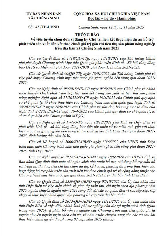 THÔNG BÁO Về việc tuyển chọn đơn vị đăng ký Chủ trì liên kết thực hiện dự án hỗ trợ phát triển sản xuất liên kết theo chuỗi giá trị gắn với tiêu thụ sản phẩm nông nghiệp trên địa bàn xã Chiềng Sinh năm 2025